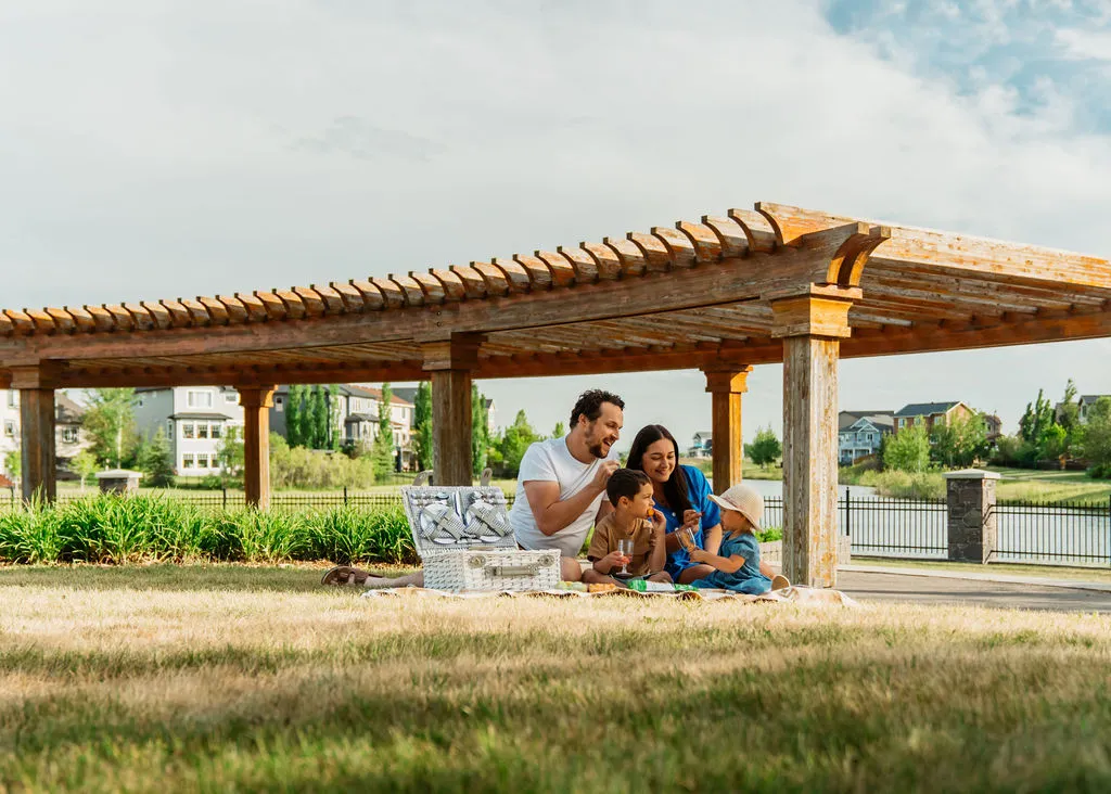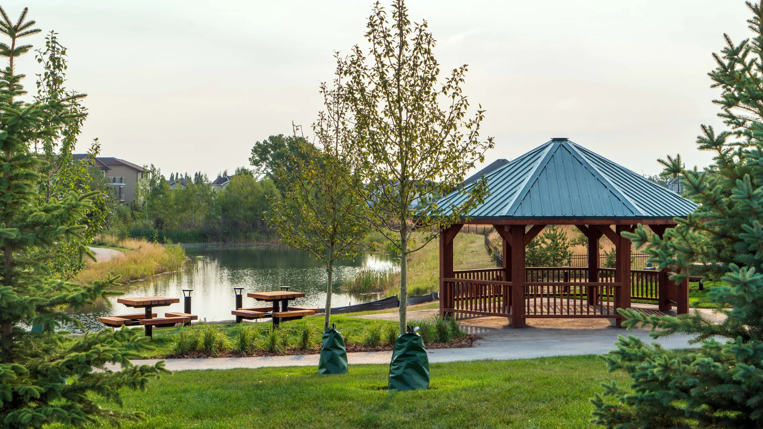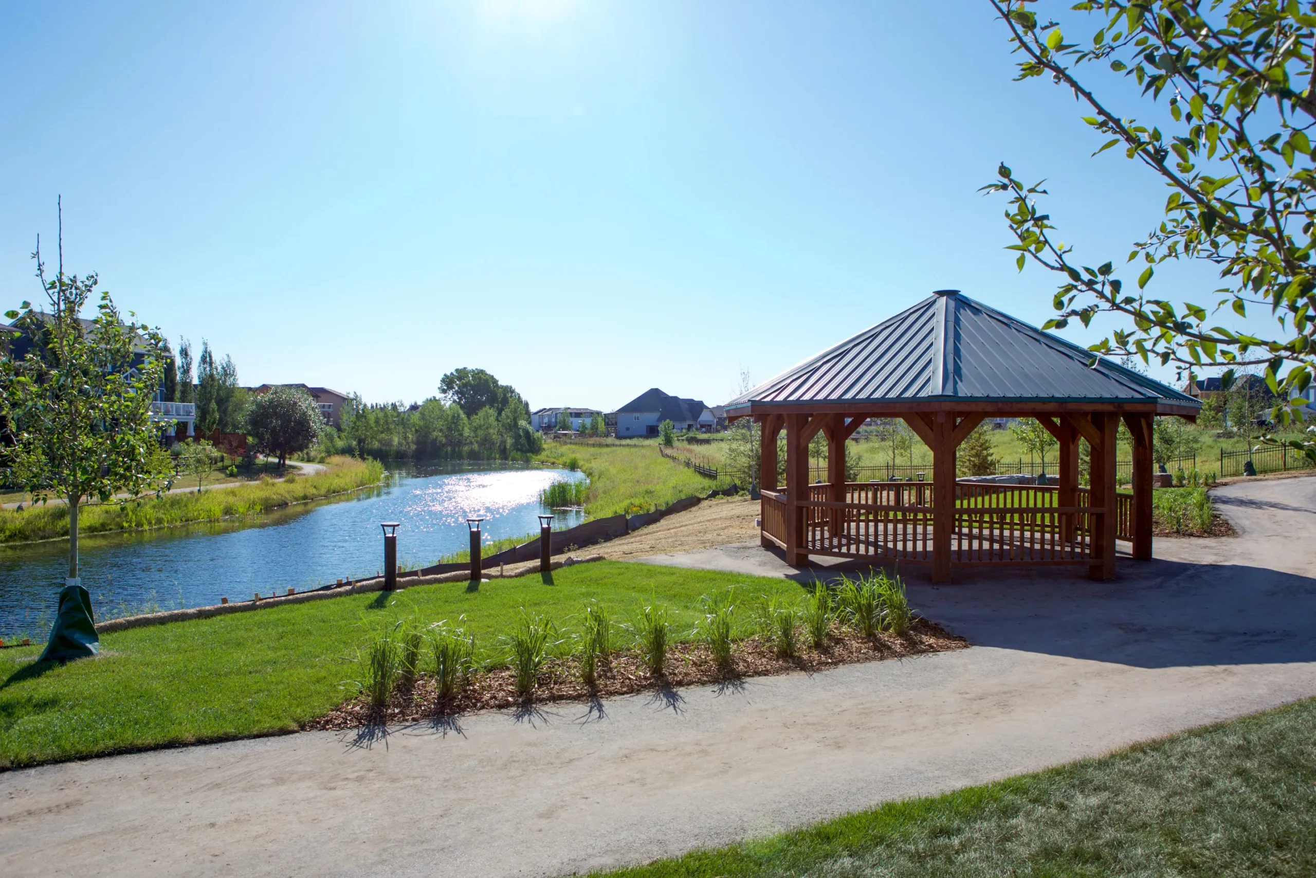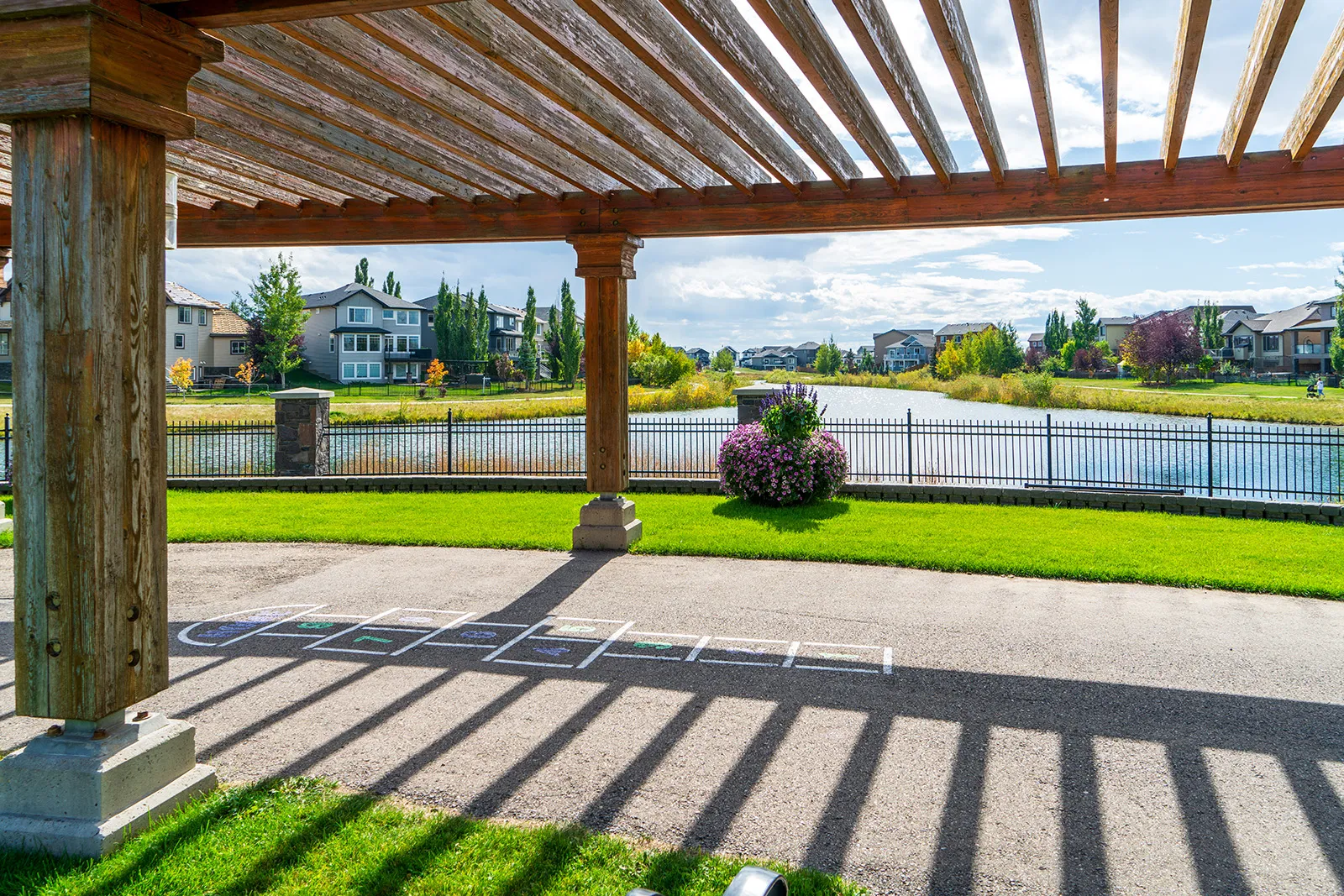 Beautiful pergola lookout overlooking the pond and parkspace.